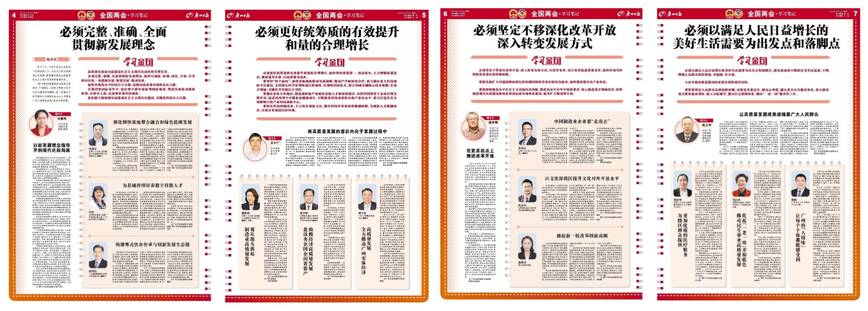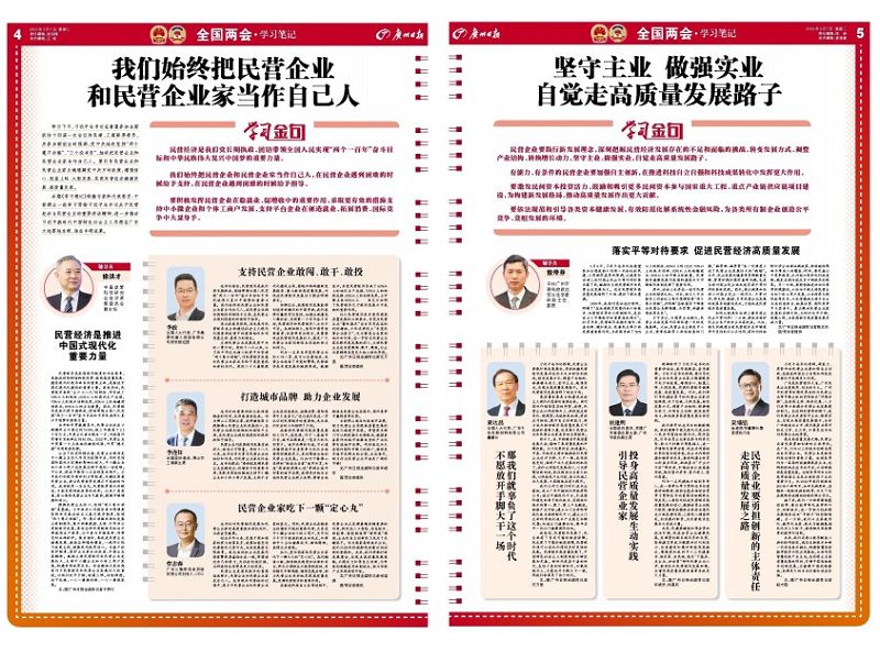 3月6日,习近平总书记在看望民建工商联界委员时强调民营经济高质量发展,《广州日报》再次第一时间推出2个大版《学习笔记》。