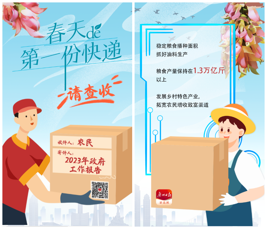 《叮~春天的第一份快递到了,请查收!》交互海报,紧扣政府工作报告提出的主要预期目标,以收取快递的创意形式生动呈现不同人群将收到的“民生政策快递”;