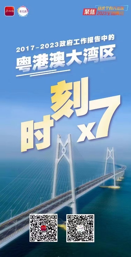 《@粤港澳大湾区×7》产品,以创意组合海报形式回溯2017年以来政府工作报告中关于粤港澳大湾区的表述;