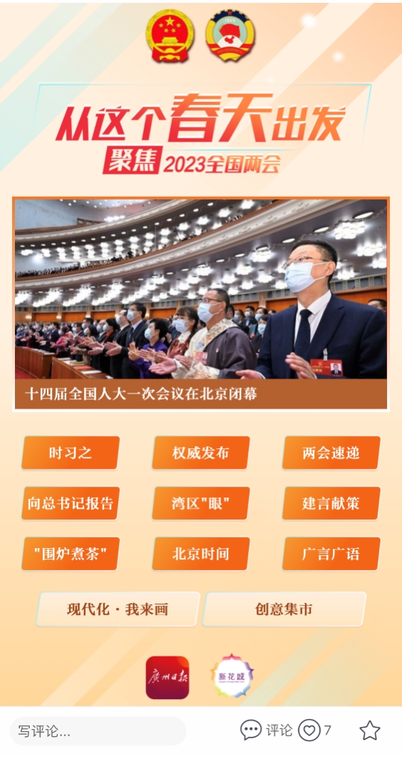 2023年全国两会胜利闭幕。今年两会,广州日报成立报道专班,组建精锐团队,全程围绕“三个聚焦”用“新”做足工夫。我们聚焦深入学习宣传贯彻习近平总书记系列重要讲话精神这一核心主题,聚焦充分讲好粤港澳大湾区和广东高质量发展故事这一本地特色,聚焦创新融媒手段提升报道渗透率触达率这一传播目标,依托新矩阵,打造新平台,用好新技术,激活新表达,提升新传播,一路推陈出新、“新”“新”向融,全方位、高分贝传递两会好声音。