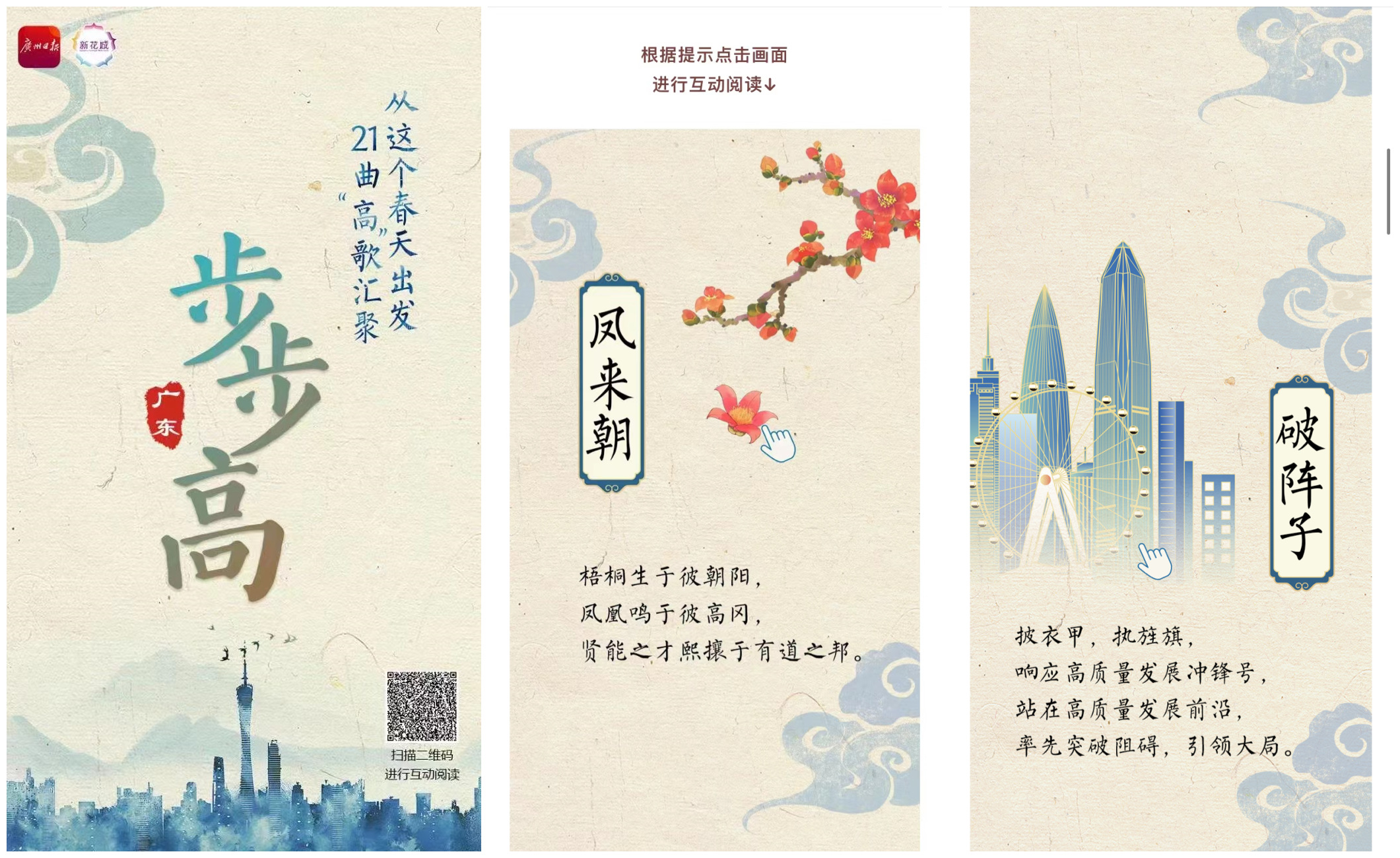 3月9日,推出《高↗高↗高↗》国风动效山水长卷,用词牌名串联起广东21地市高质量发展特色,形成一幅中国风的动效山水长卷;