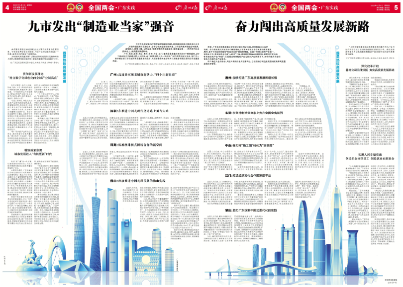 3月3日,推出《现代化 中国“画”·广东加快推进高质量发展一线走读》全媒体特别报道。立足“名画新作”创意,由广州画院画家团队挥毫创作并融合AI绘画技术创作《珠江盛景图》精美画作,以大气磅礴的中国画生动展现广东加快推进高质量发展的鲜活图景。报纸推出12个大版,新媒体推出《乡村寻宝记》《上天入地极限探秘》等4集VLOG动画视频和《广东步步“高”》H5,被人民日报客户端首屏转载。