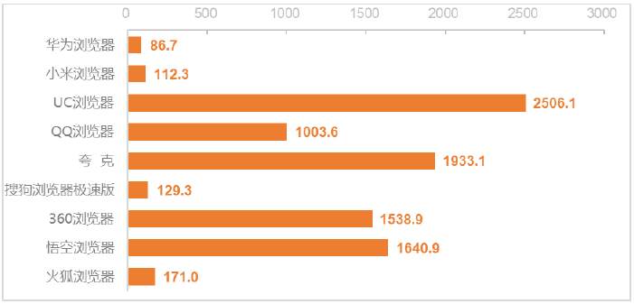 (3)9款App后台静默12小时,上传数据流量平均⁽⁶⁾最多的为UC浏览器,约为2506KB;平均最少的为华为浏览器,约为87KB。具体情况如图3。