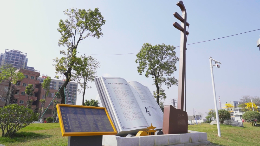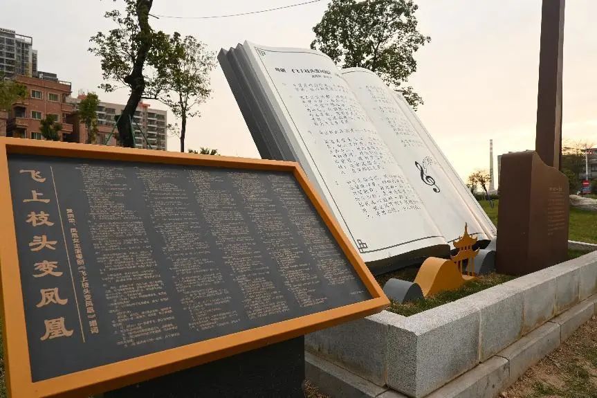 在高大的粤剧音乐代表性乐器——高胡的雕塑下,精心打造了麦炳荣经典粤剧唱段《飞上枝头变凤凰》的唱词展示,同时配备了自动感应播放装置,只要有游客靠近并驻足观看唱词,对应的粤剧唱段就会自动播放起来。麦炳荣先生厚实而充满沧桑感的“牛荣腔”唱词穿越时空,回响在粤剧公园上空,让很多熟悉他的本地戏迷十分感动。