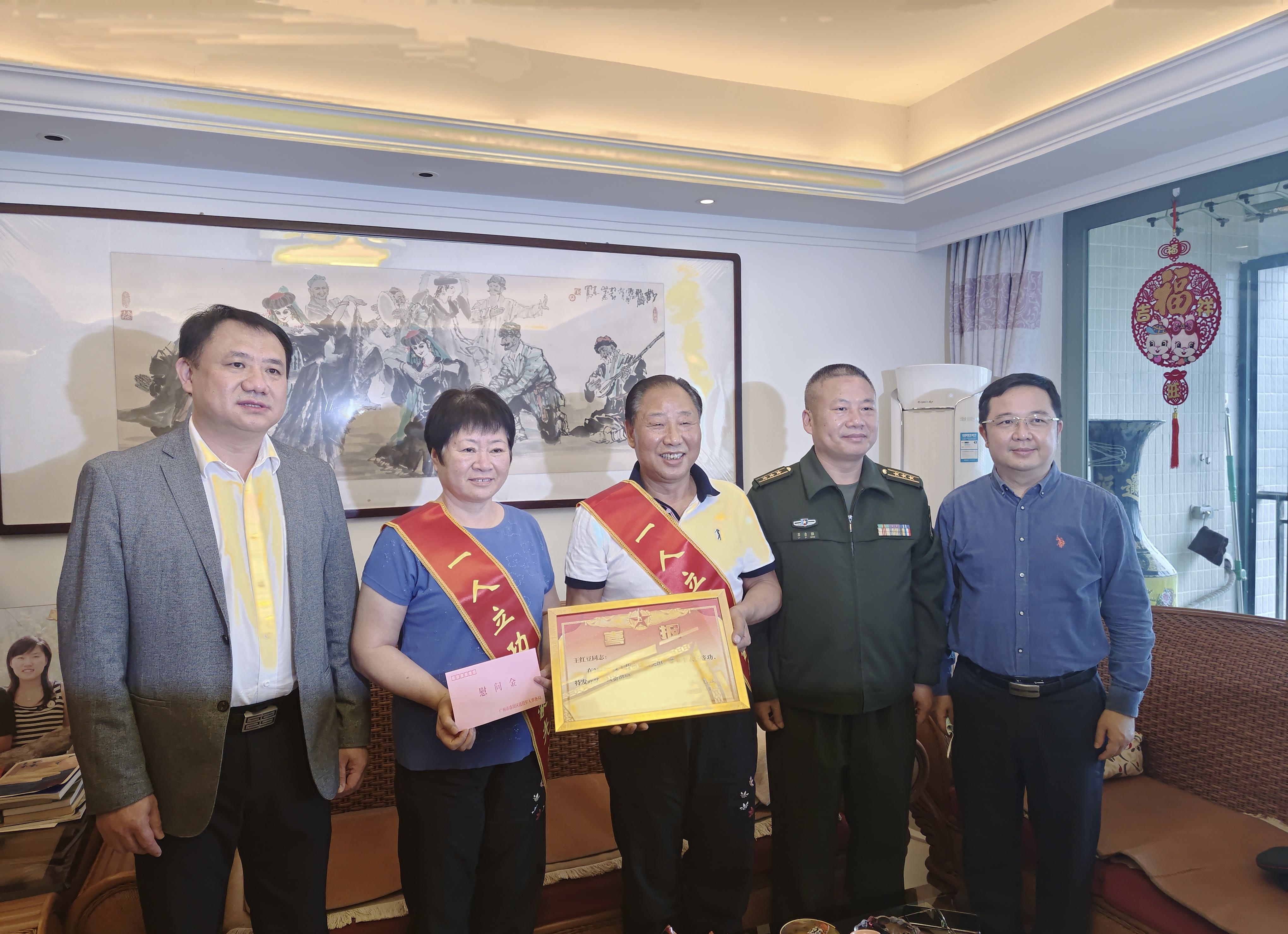 3月13日下午,番禺区领导以及区退役军人事务局负责人,南村镇、桥南街相关领导组成慰问组,先后来到南村镇华南新城社区、桥南街陈涌村和蚬涌村,为荣立三等功的现役军人王红豆、黄泽林、黄志锋家属送去立功喜报并进行慰问,感谢他们对国防事业的支持和奉献。