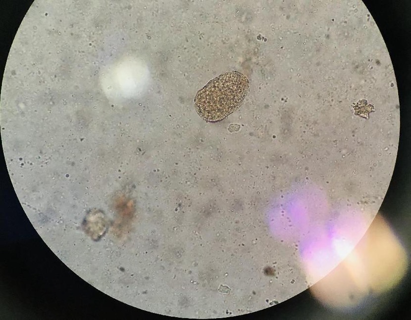 经检验科全自动粪便检测仪检测,在仪器中发现了钩虫卵的图片,随后通过寄生虫检验之饱和盐水浮聚法,进行人工显微镜下找虫卵。经过人工复检以及形态学分析,充分肯定患者大便中有钩虫卵。