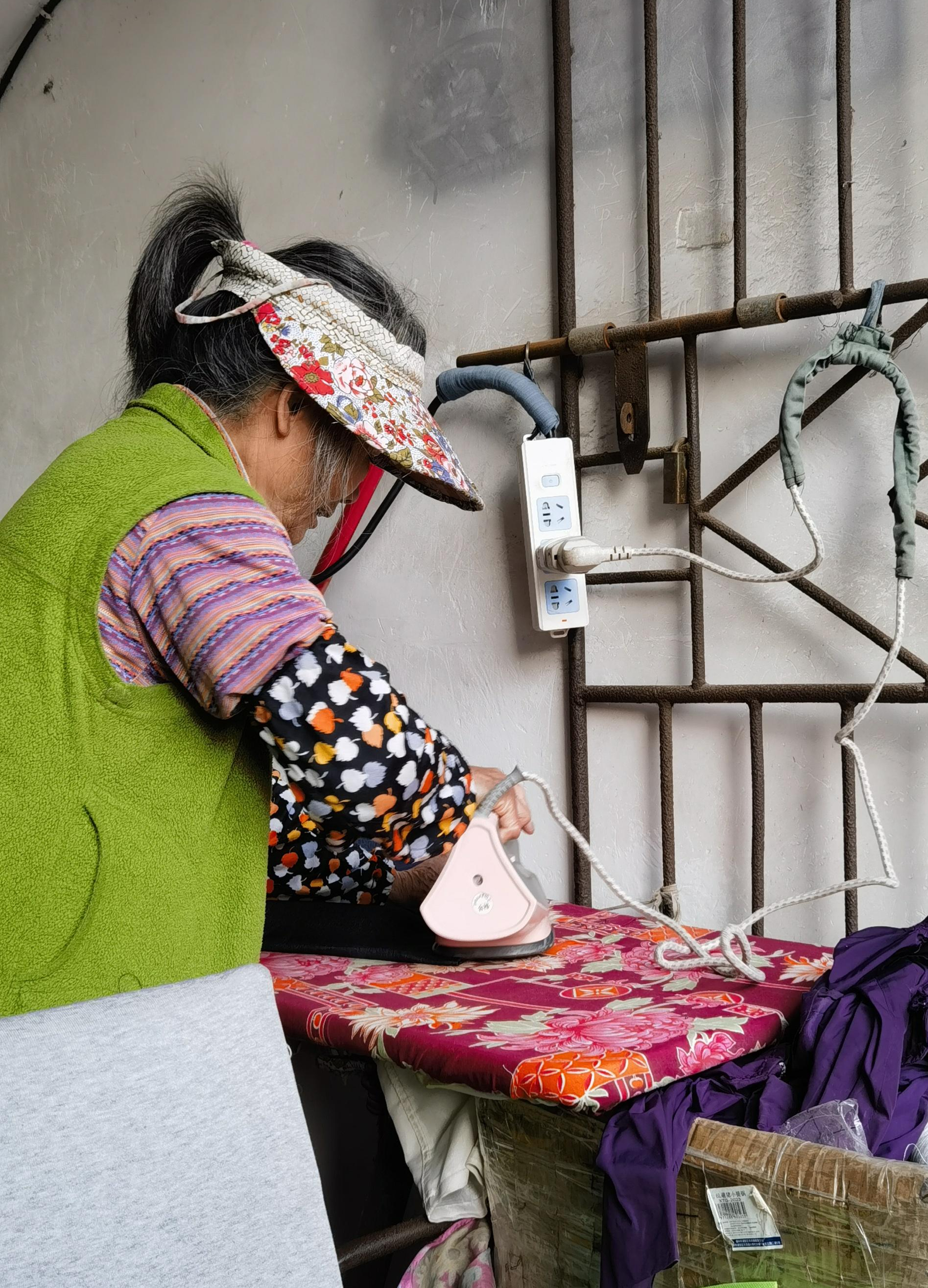 嗒嗒嗒......脚踩踏板,衣服就一点点向前。一台缝纫机车、一个装碎布箱子以及一张用三轮车架起的熨斗台就是她补衣摊的全部家当。