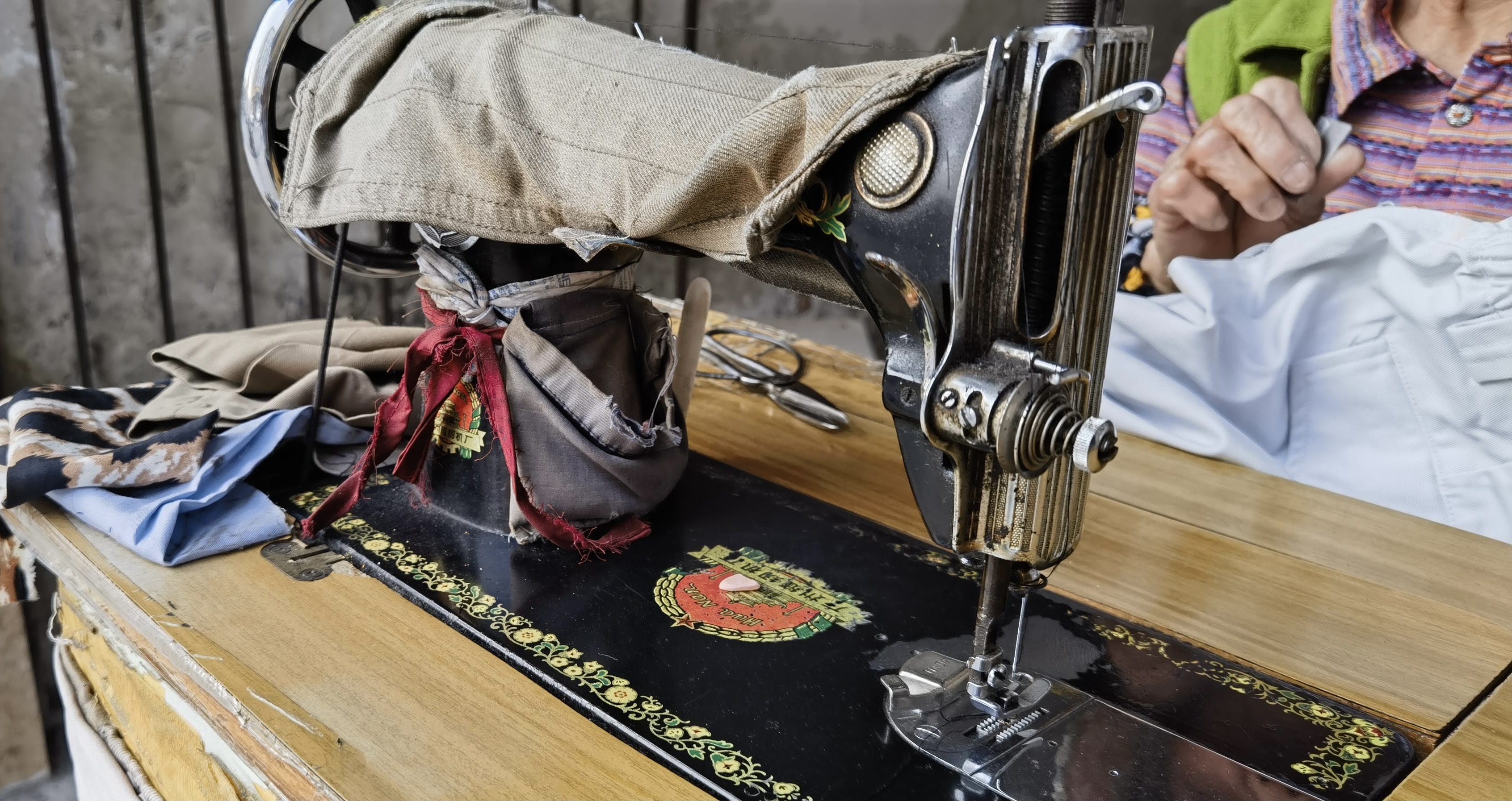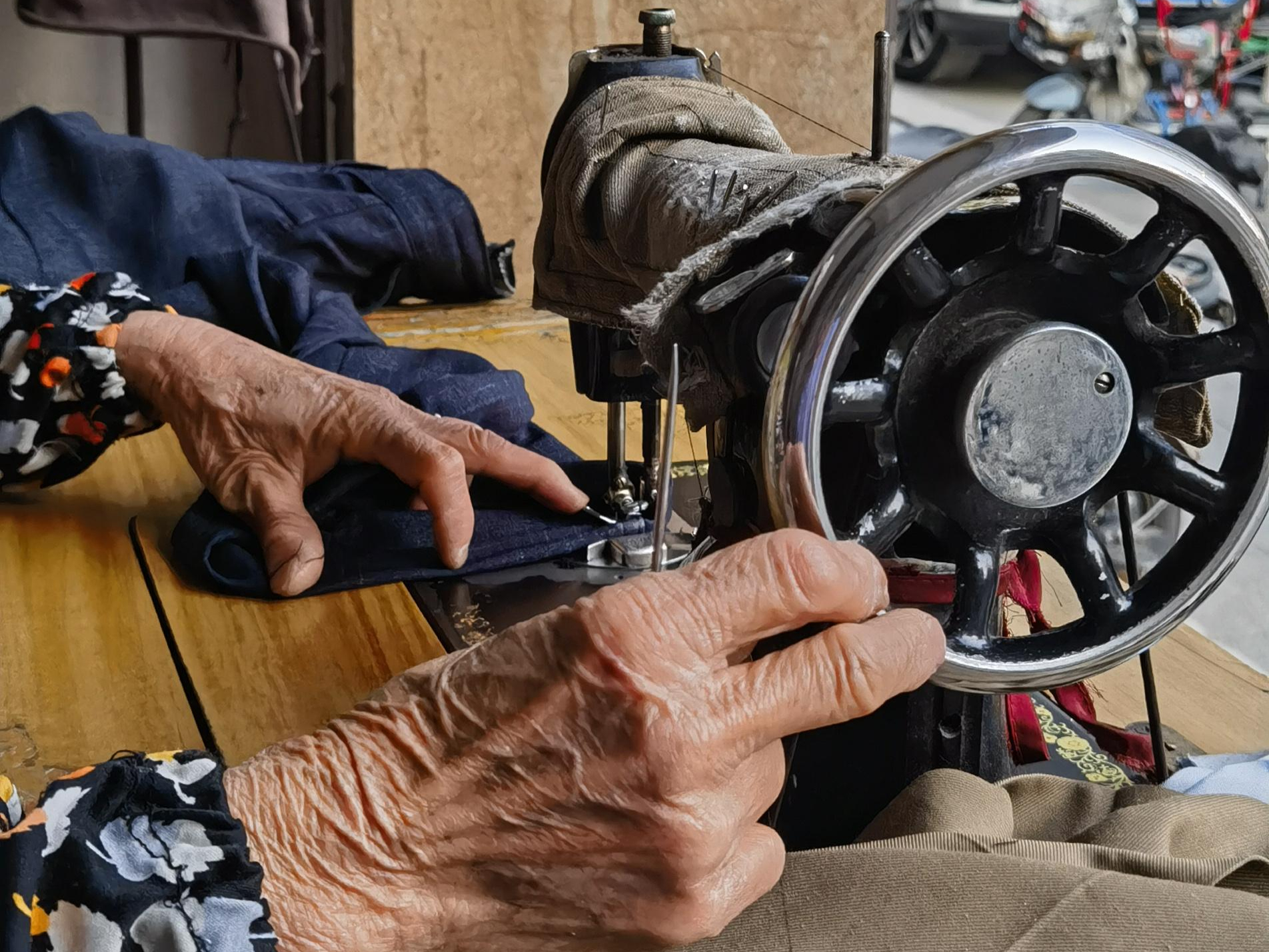 只见这台印着“广州缝纫机厂”的缝纫机外表已有不同程度的磨损,车架子也有多处用透明胶粘着。头发花白的张阿姨临街而坐,头戴着一顶花帽子,她略显苍老的双手,穿针换线的手法却格外娴熟。