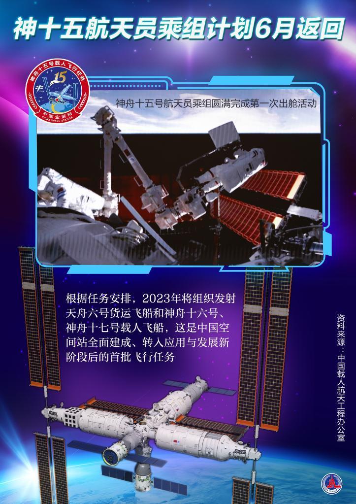 记者从中国载人航天工程办公室获悉,目前,中国空间站组合体在轨稳定运行,神舟十五号航天员乘组状态良好,计划于今年6月返回地面。