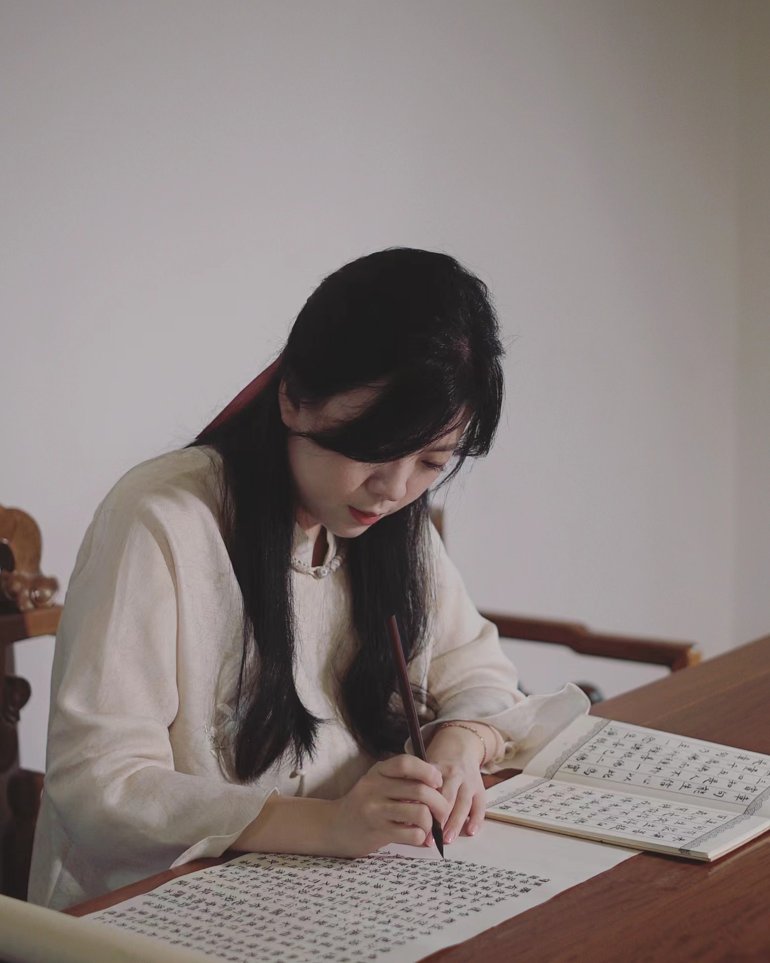 在挥毫泼墨方面,朱梓宁则显示出了实打实的专情投入。她坦言,作为一名职业女性,一天当中可能要处理非常多的事务,心情难免会有高低起伏,而她的排解方法之一,就是练习书法。“这个过程非常享受,也是一天当中难得的独处时光。对我来说,这是一种很好的自我调节方式,临帖完成后的酣畅淋漓,通常会让我忘了白天的烦恼。”她说。