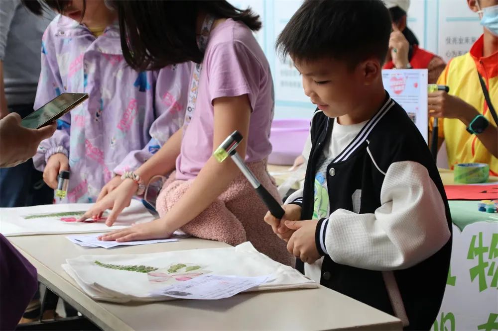 在环保体验摊位区域,设有“植物贴花”“植物拓染”“亲子共绘地球村”等有趣的活动。干枯的花草在环保小天使的巧手创意之下又开始“焕发生机”,成为一幅幅创意手工画和精致的帆布袋。