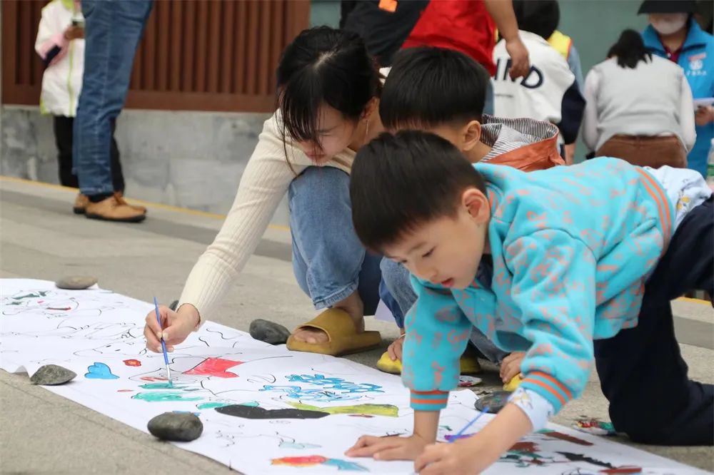 “亲子共绘地球村”摊位上,5米画卷旁,居民一笔一画勾勒着对绿色环境的向往。