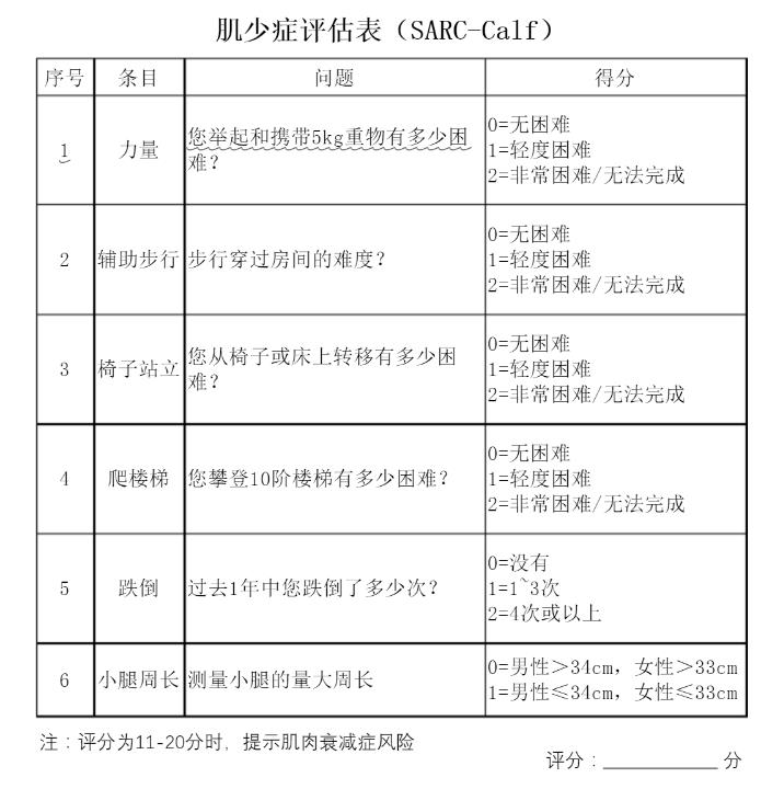 通过肌少症评估表自测,如果评分≥11分,要关注,可能有肌肉衰减症风险(表格如下)。