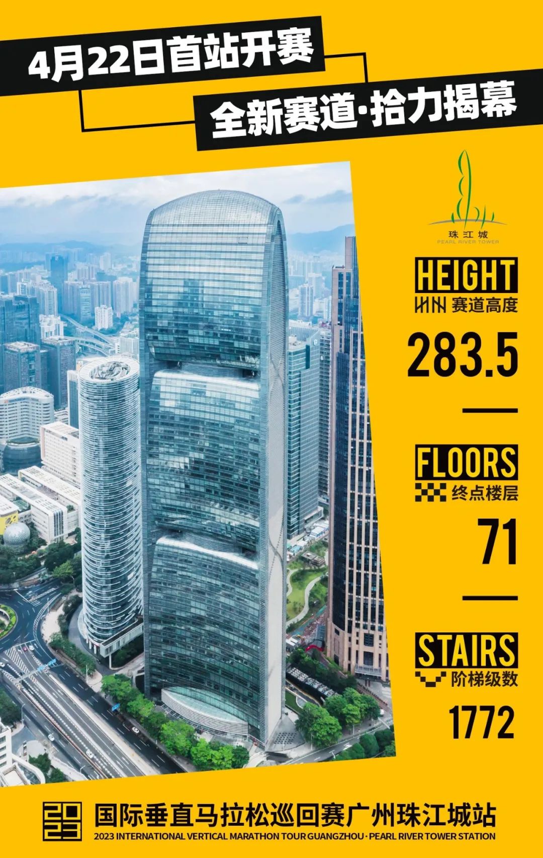 据介绍,广州珠江城大厦高度309.6米,赛道高度283.5米,终点楼层71层,阶梯级数1772级。