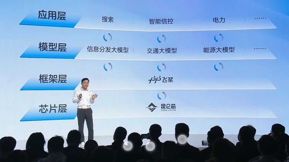 人工智能时代,使得IT技术的技术栈从过去的三层——芯片层,操作系统层和应用层,现在分为四层——芯片层、框架层、模型层和应用层。从2010年起,百度在这四层陆续进行全栈布局,例如芯片层的昆仑芯,框架层的飞桨深度学习框架,模型层的文心预训练大模型,和应用层的搜索、智能云、自动驾驶等。