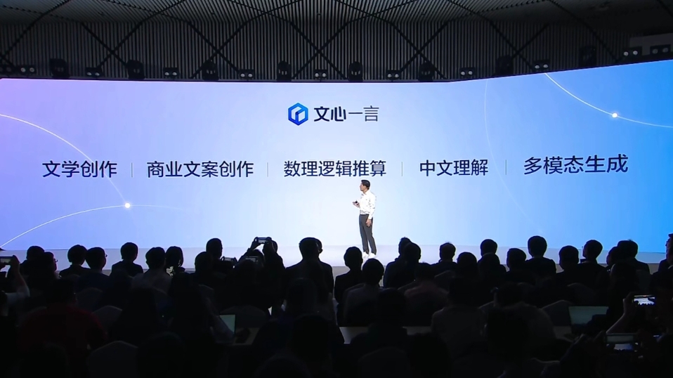 1小时7分钟的发布会,占据另一半时间的是百度首席技术官王海峰,他负责解读文心一言的技术特性及其背后超越10年的技术积累。“百度已经积累了全栈的人工智能的能力,从芯片层到框架层、到模型层到应用层,每一层我们都有很领先的技术和产品。文心一言能迅速地推出,也是基于这10余年的积累。”他说。