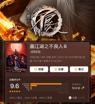 作为不良人系列的续作,自3月2日播出以来,《画江湖之不良人6》再创该系列口碑高峰——豆瓣开分9.6分,创近5年动画最高分记录,迅速发酵的口碑让喜欢该系列的观众欣喜之余,更期待后续剧情的开展。