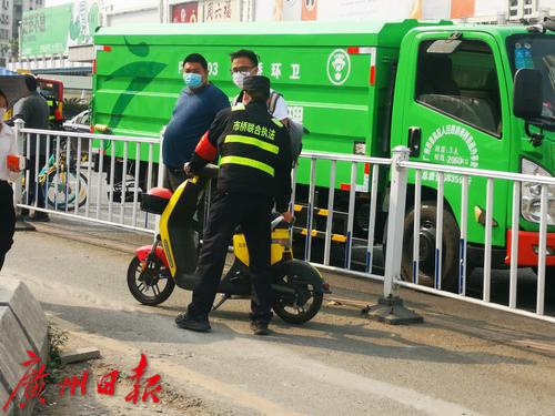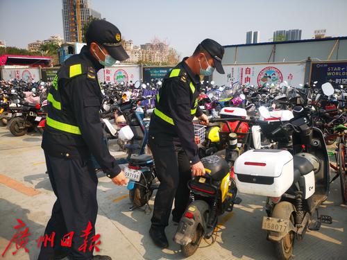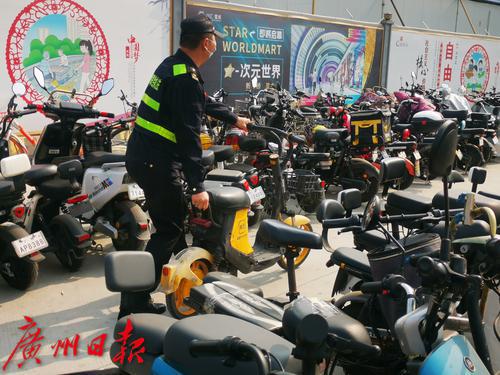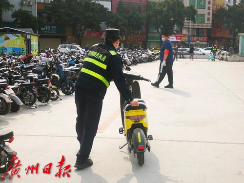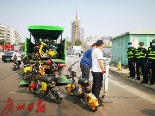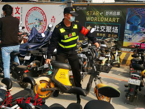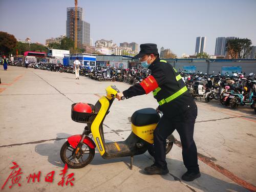 在番禺区市政道路、公交站、地铁口等公共场所出现了不少共享电动单车,这些车辆没有办理登记上牌,乱停放、缺头盔等现象比较突出,存在不少安全隐患,近期,番禺区相关部门、各镇街对乱停乱放的共享电动单车持续开展整治。3月16日上午,在市桥地铁站A出入口和D出入口,每个出入口外面的非机动车停放点都停放了密密麻麻的电动自行车,市桥街综合行政执法办的执法队员正在巡查整治,对乱停放的共享电动单车进行搬移。记者观察了半个多小时,执法人员在市桥地铁站D出入口清走了10多辆共享电动单车。