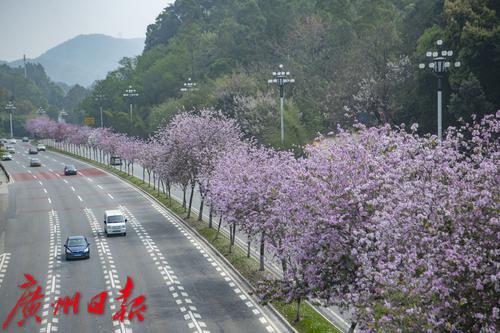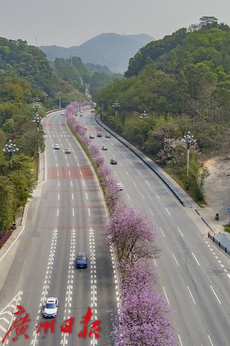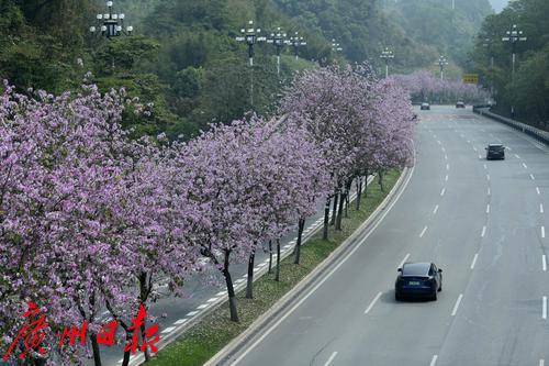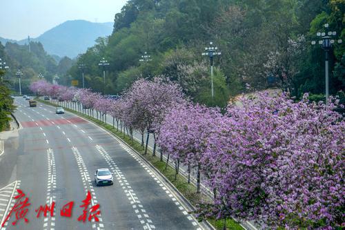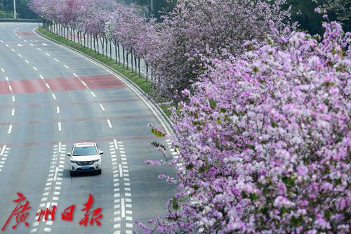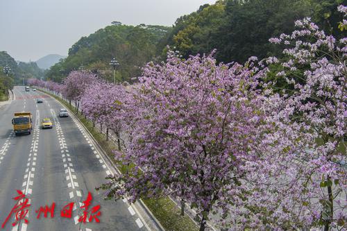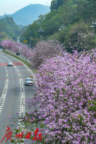 图为广汕公路中央绿化带的紫荆花开得正盛。