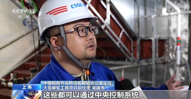 中国船舶外高桥造船邮轮办公室主任 大型邮轮工程项目副经理 易国伟:电缆要提供控制信号,这条船它也是智能化的一条船舶,所有上面用的娱乐设施、照明设施,都可以通过中央控制系统来控制。