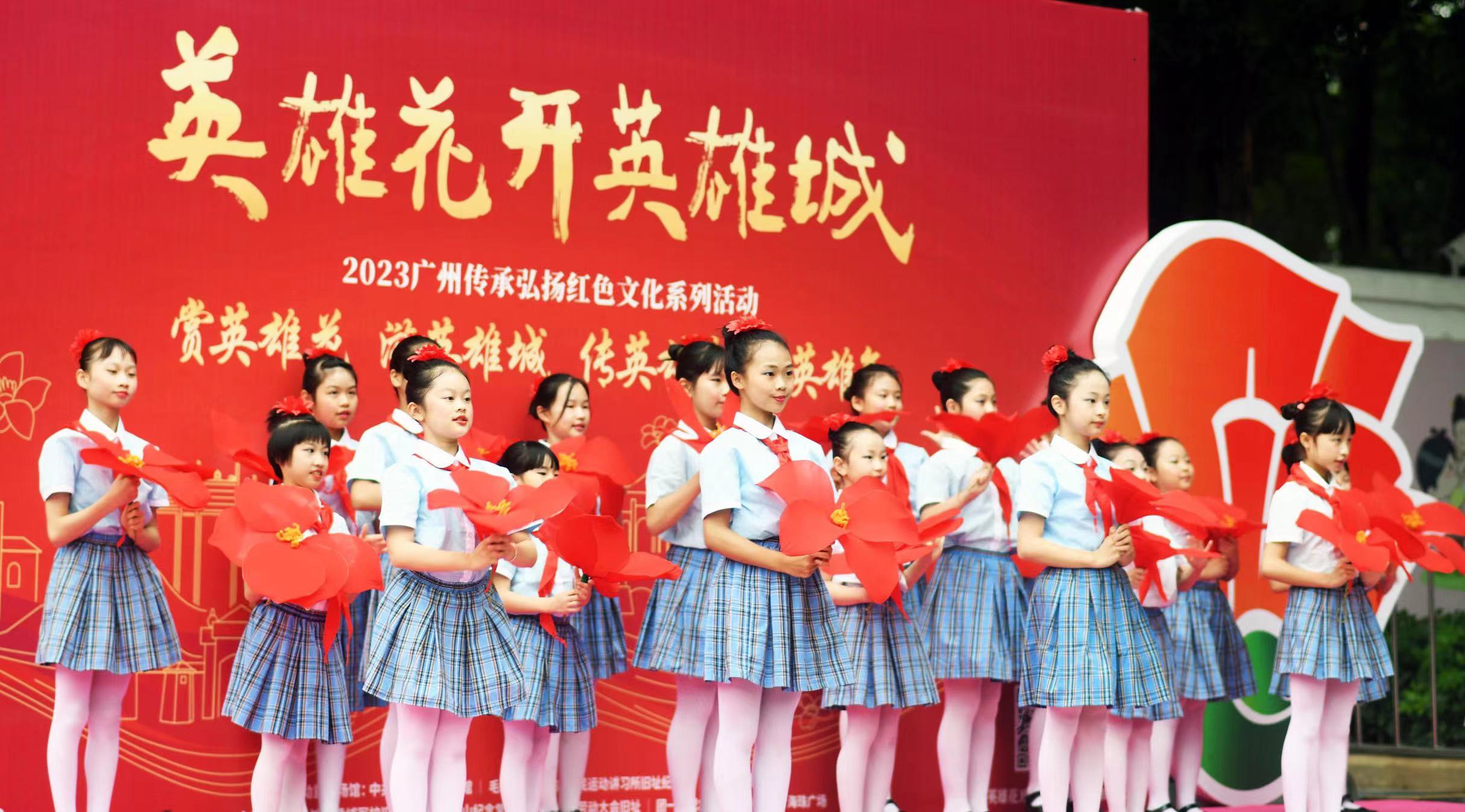 紧接着,由中山三路小学、天河区沙河小学、荔湾区蒋光鼐纪念小学、天河区元岗小学和广州东华职业学院艺术团分别带来舞蹈《英雄花开英雄城》、刺杀操《不负韶华,强国有我》、旗语操《挺进深蓝》、大型绘画成果展示《英雄花开英雄城》和舞蹈《红色追梦人》。学生用舞蹈和歌舞的形式,展现他们对英雄的崇高敬意和强国有我的铮铮誓言。