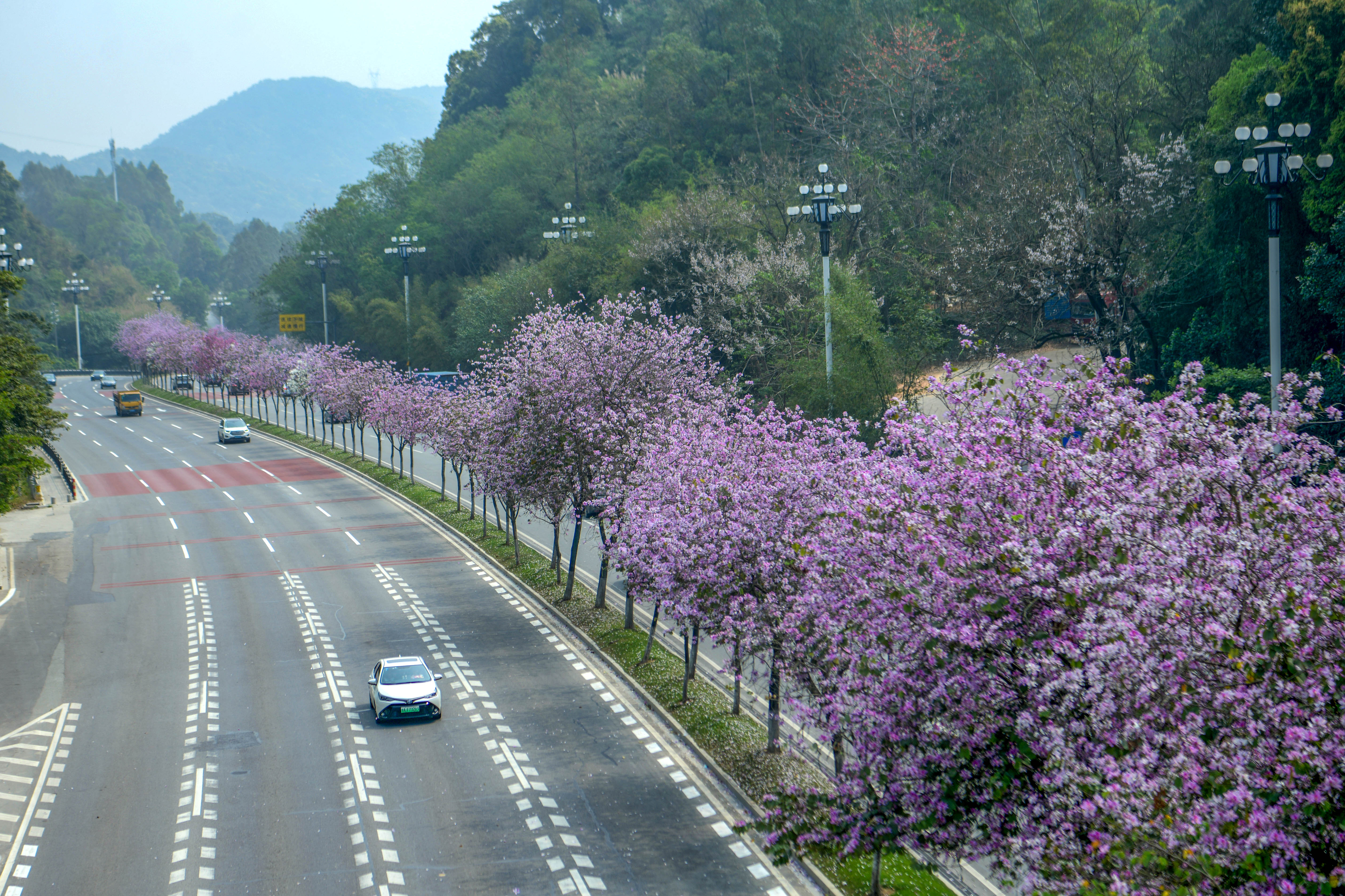 驱车经过全长约7公里的广汕公路(长平-金坑段),中央绿化带1000多株宫粉紫荆铺开一路春色,紫、白、粉三色花瓣夹杂交错,美不胜收,仿佛穿越一条长长的花带。广汕公路(长平-金坑段)曾被评为广东省“十大最美普通国省干线公路”。位于该路段的广汕公路骑行绿道集骑行、步行、观光、休闲等多功能为一体,连接科学城与知识城,沿途串联长平、黄登、黄麻等村落山水人文,不仅是市民漫步骑行、踏青赏绿的好去处,更是一条乡村振兴与产城融合的绿色生态廊道。