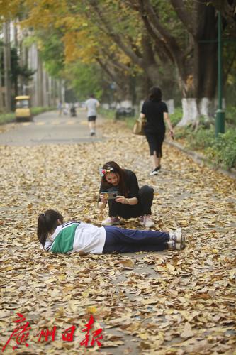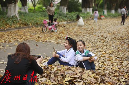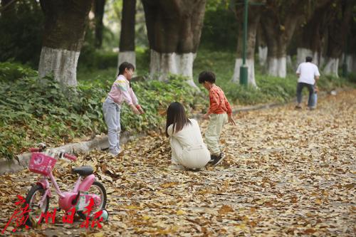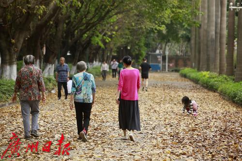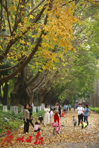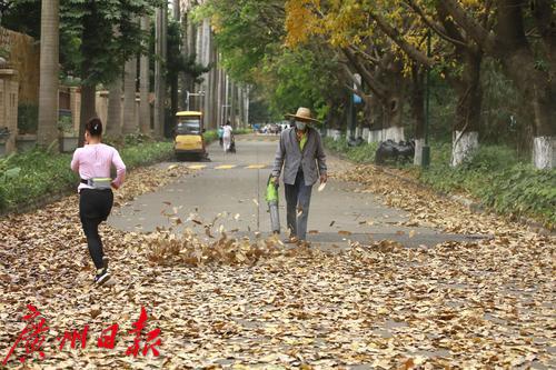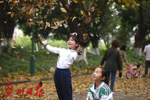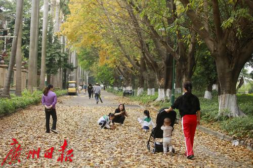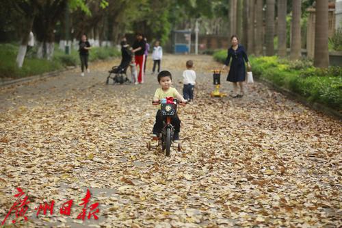近日,随着气温升高变化,广州大街小巷处处繁花盛开。不过,除了繁花以外,还有满城黄叶飞舞。这种“返秋”的现象,成了城市中一道美丽的风景线。在番禺丽江花园一处社区道路,两天时间路边的大叶榕就落了满满一地的黄叶,吸引大小朋友来这里疯狂拍照打卡。