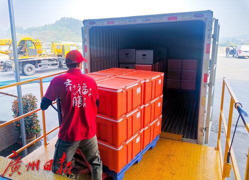 工作人员将打包好的餐盒装进保温箱