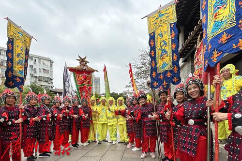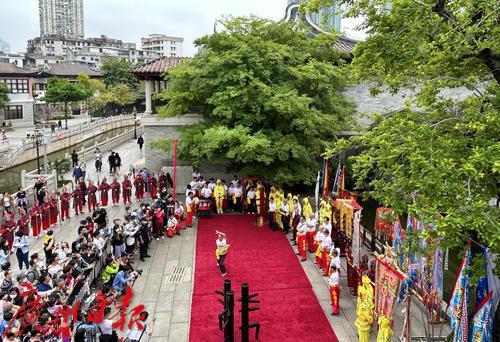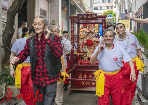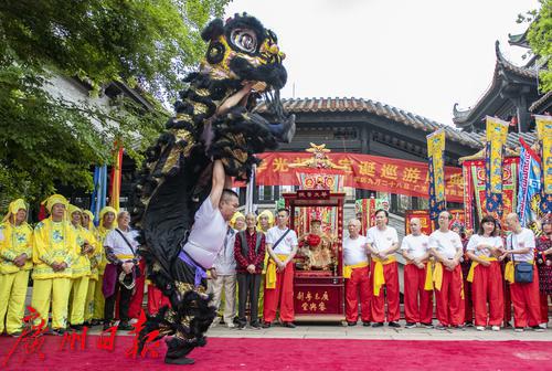 3月20日,“粤剧华光祖师诞”巡游活动在永庆坊举行。上午9点半,在恭请华光祖师像仪式之后,銮舆堂的八名成员抬着銮舆开始出巡。巡游队伍以开道锣、高脚牌、各式旗帜以及十八般兵器等仪仗开路,龙虎武师队、醒狮队随行。随后巡游队伍来到粤剧艺术博物馆石碑广场,为大家作了翻跟斗、醒狮和武术等精彩表演。