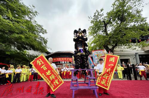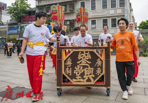 巡游队伍来粤剧艺术博物馆石碑广场,作醒狮、武术等表演。