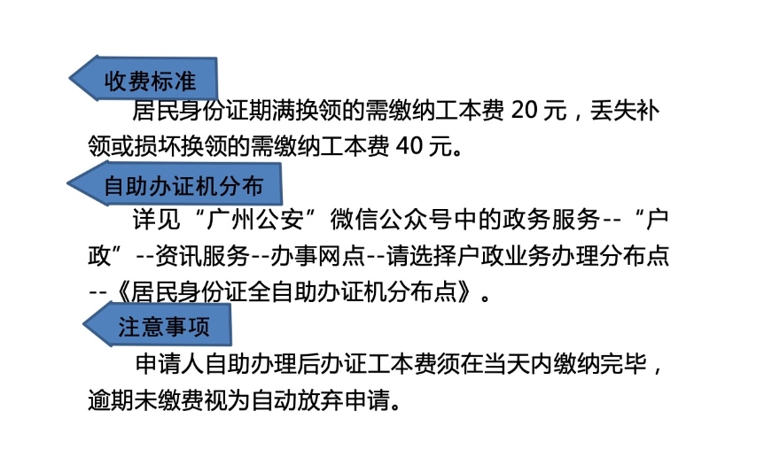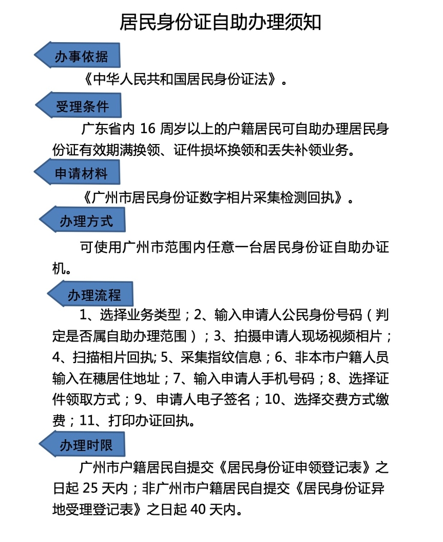 申办人属于年满16周岁以上的广东省户籍居民,需办理补、换领居民身份证业务的,可通过设置在全市的身份证自助终端,自助完成电子申请表的填写、指纹采集、现场人像比对、缴费、回执打印等流程,整个过程最快3分钟就可轻松完成,免去预约、排队等候的烦恼。