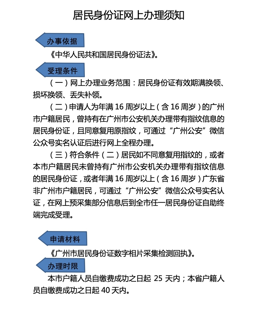 申办人属于本市户籍年满16周岁以上,曾经领取过本市公安机关、签发带有指纹信息的二代身份证的,在办理到期换证、损坏换证、丢失补领居民身份证业务时,可登录“广州公安”微信公众号实现全流程在线申请。