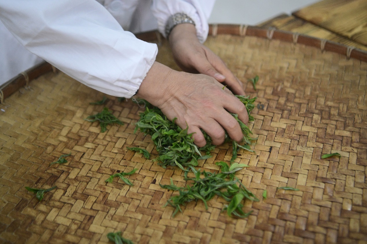 这一环节用晒干或阴干的方式蒸发鲜叶水分,消除部分的青草味,使其焕发出清香,不仅维持了嫩芽鲜香柔和的特质,也最大程度地保留了茶叶的营养成分。制茶师傅凭借丰富的经验把控蒸发程度,只有在鲜叶的含水量降低达到一定的程度,使叶质柔软,韧性增强,便于造型时,才可以进入下一道工序。