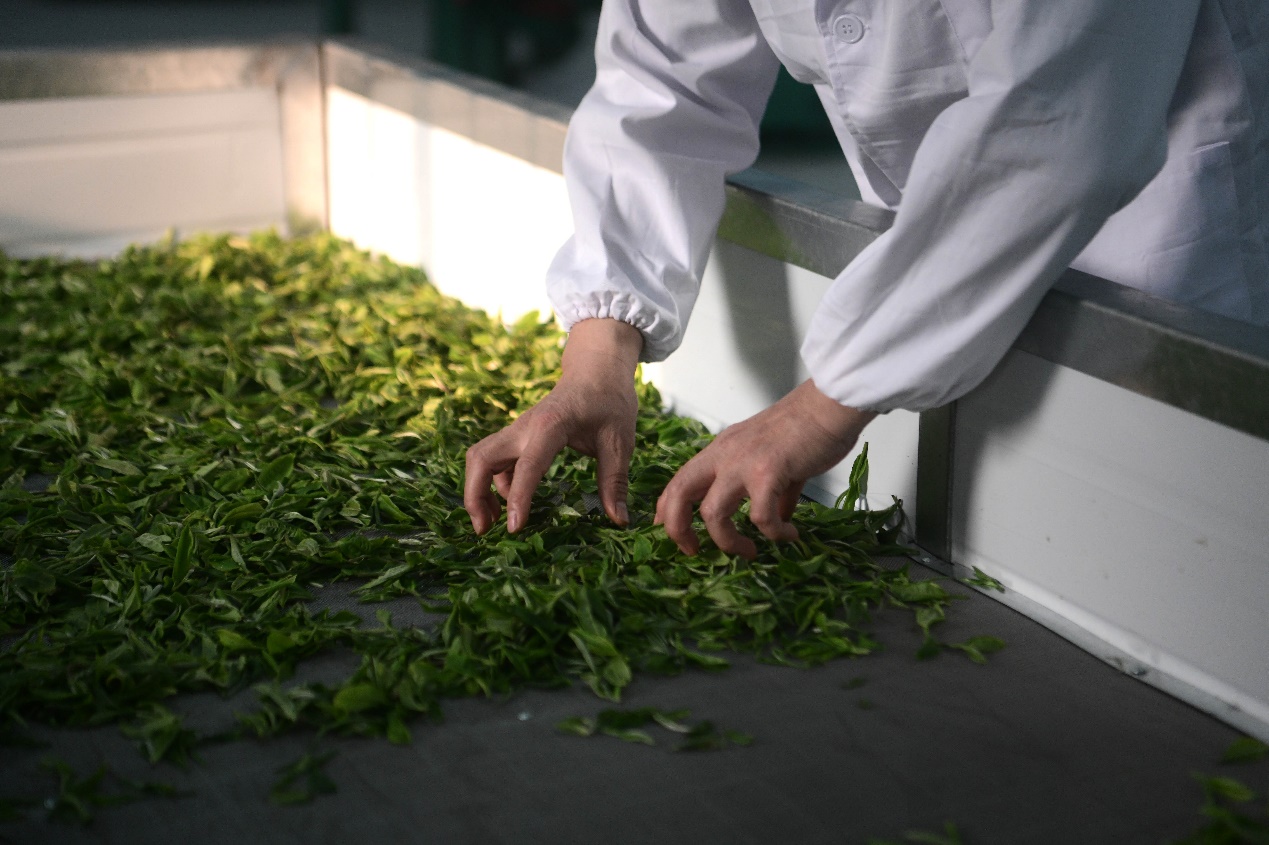 湖南农业大学黄埔研究院研究员董日波正专注地挑选叶片,据介绍,新采摘的嫩芽必须经历萎凋环节。