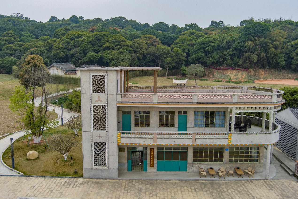 广场另一侧,经过升级改造,岭头村口两层办公楼房改造成为“黄埔红”文史馆、砖房改造成茶室以供观光、休憩、品茶。建筑外墙雕花的窗台、白绿相间的瓷砖、湖蓝的铁门和重新上漆的铁窗,有浓郁的复古格调。