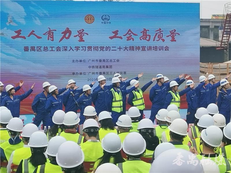 3月20日上午,番禺区总工会、中铁隧道局集团联合在广州大学城中铁隧道局琶洲支线项目工地举行了“工人有力量,工会高质量”——番禺区总工会深入学习贯彻党的二十大精神宣讲培训。