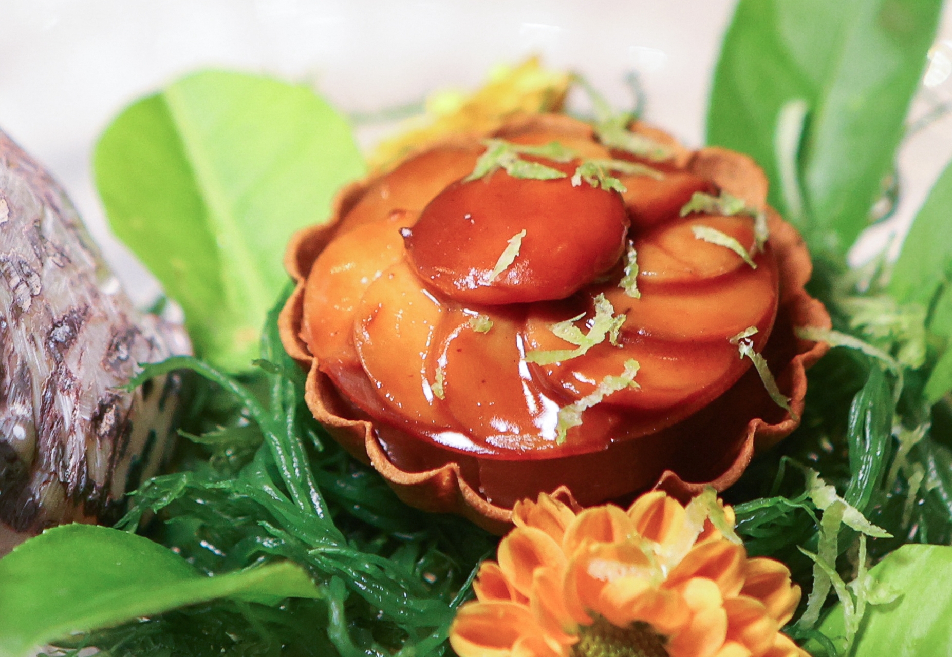 主厨在鲍鱼上“落足心机”,硵洲岛的九孔鲍鱼经过8小时的焖制再冷冻改刀,有机农场岛上的香水柠檬制成柠檬水,泡过北海道扇贝和海胆,作为中部的精华,塔壳部分是运用到鲍鱼胆做成的酥壳,前菜甫一上桌,再现场刨洒上香水柠檬皮,海洋的鲜味即刻被清新的柠檬丝香调动出来,将春天的清新带到了餐桌,味蕾瞬间打开;鲍鱼的另一演绎是做汤品,用海朵自家生机场养的湛江海神湾扇鸡起骨熬成汤底,现场用火山岛九孔鲍鱼与扇鸡片过桥堂做汤品,有别于冬日里的浓郁汤品,这碗过桥做法的鲍鱼鸡汤,更合春天的胃,配上主厨的灵魂酱汁葱茸酱和姜葱,是为一绝。