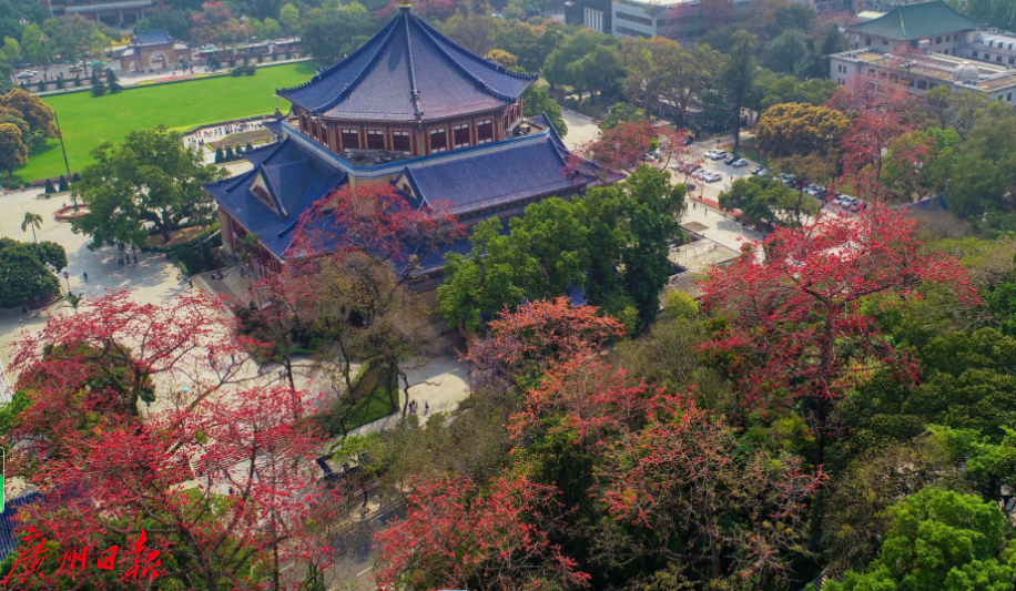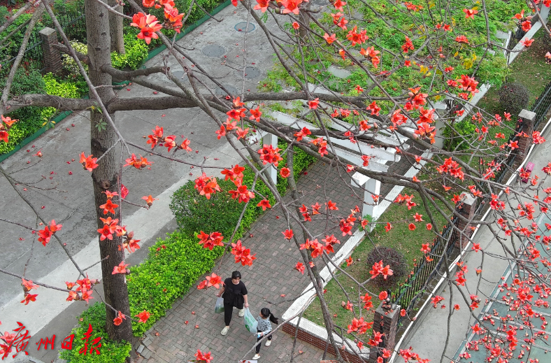 在老城区,同样能觅得别样春色。在越秀区,逾30棵木棉树在陵园西路路中依次排开。恰逢3月,站在火红的木棉树下细看木棉花:五片厚实的花瓣,包围着一束黄色的花蕊,花朵艳丽而不媚俗。木棉花自古亦有英雄花之称。抗清志士陈恭尹曾写下“浓须大面好英雄,壮气高冠何落落”的名句,张维屏也曾咏赞木棉:“烈烈轰轰,堂堂正正,花中有此豪杰。一声铜鼓催开,千树珊瑚齐列。”