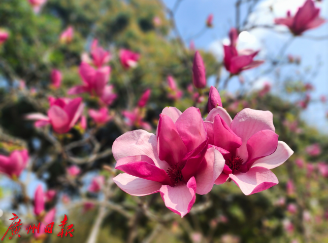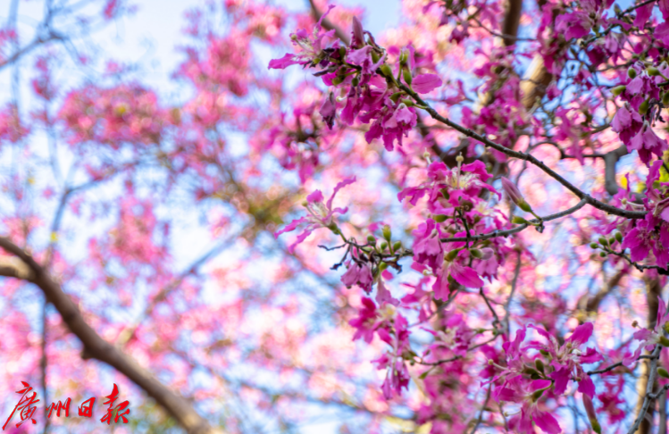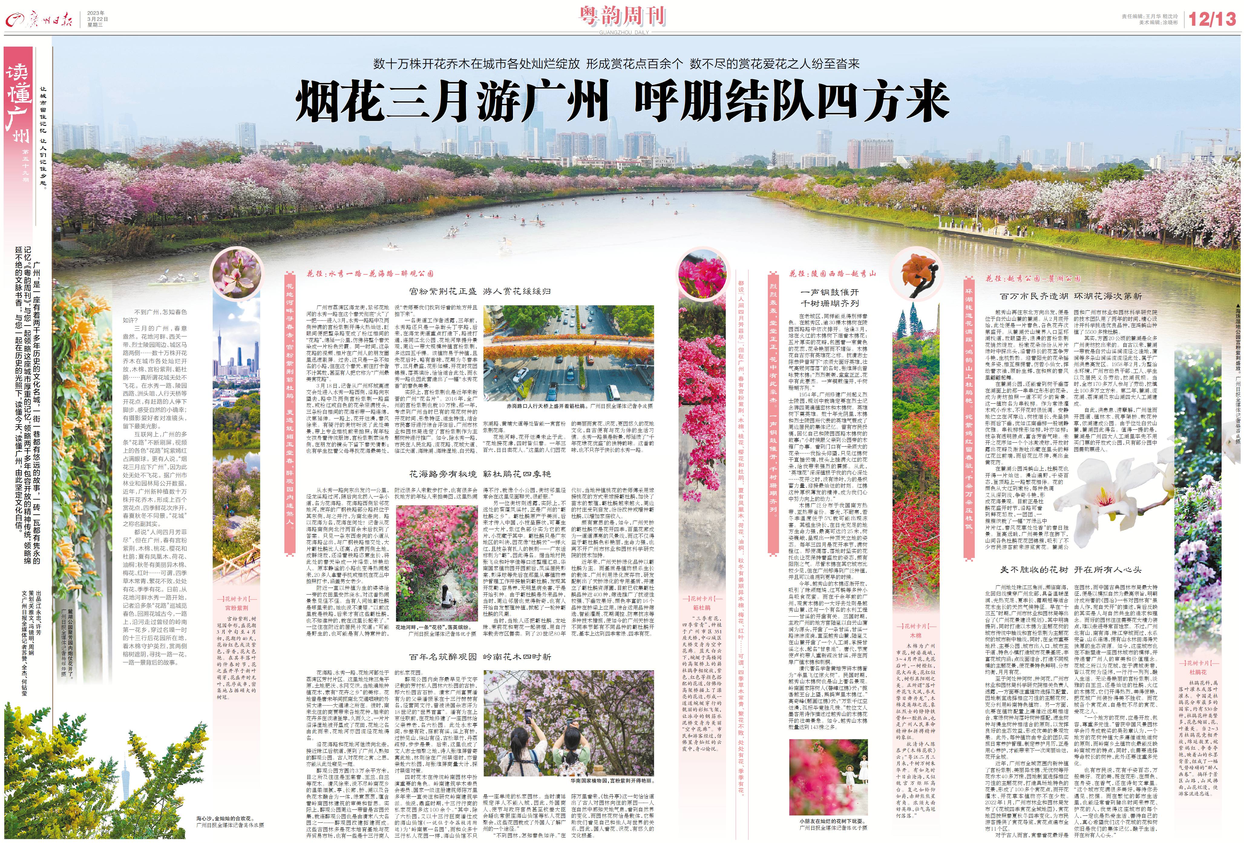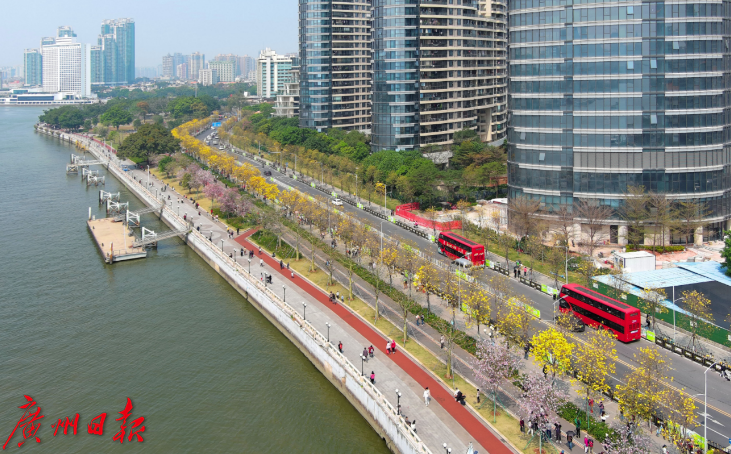 三月的广州,春意盎然。花地河畔、西关一带、烈士陵园周边、城区马路两侧……数十万株开花乔木在城市各处灿烂开放,木棉、宫粉紫荆、簕杜鹃……真所谓花城无处不飞花。在水秀一路、陵园西路、洲头咀、人行天桥等开花点,有赶路的人停下脚步,感受自然的小确幸;有摄影爱好者对准镜头,留下最美光影。