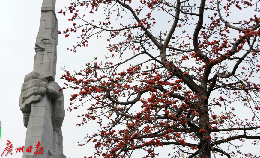 1954年,广州修建广州起义烈士陵园,规划中就确定要在烈士纪念碑四周遍植密林和木棉树。英雄树下奠英雄。数十年光阴里,木棉和烈士陵园所代表的英雄气概成了周边居民的集体记忆。曾有市民投稿,回忆自己和陵园西路木棉树的故事:“小时候跟父亲到公园旁的木箱厂办事。看到门口有一朵硕大的花朵……我抬头仰望,只见红棉树干直插云端,枝头上挂满火红的花朵,给我带来强烈的震撼。从此,‘英雄花’深深植根于我的内心深处……花开之时,没有绿叶,为的是积蓄力量,迎接最灿烂的时刻。红棉这种厚积薄发的精神,成为我们心中努力向上的动力。”