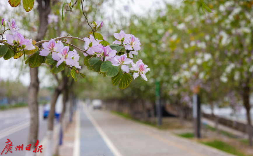3月18日,记者从广州环城高速交会处进入水秀一路西侧,沿路向东望去,路中及两侧宫粉紫荆一路盛放,或粉红或白色的花朵缀满枝头,三条粉白相间的花海彩带一路连绵,次第延伸。一路上,花开烂漫,春风徐来。有骑行的街坊听说了此处美景,带上专业相机前来拍照;有年轻女孩身着传统服饰,宫粉紫荆萦绕身侧,在朋友的镜头下留下春天倩影;也有学生拉着父母寻找花海最美处,说“老师要我们找到好看的地方并且拍下来”。