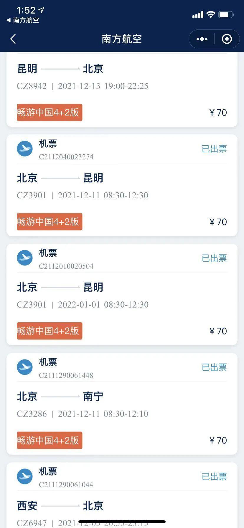 ▲陆先生2021年使用南航“畅游中国4+2版”时的出行记录。图片来源:受访者供图