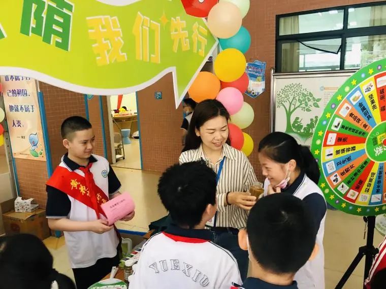 在各式摊位中被绿意包围的“绿美水荫”垃圾分类义卖摊位尤其受欢迎。尤其是特别准备的“分类大转盘”游戏十分火热,同学们随机转动大转盘,回答出最后指针指向的垃圾所属类别后,即能获得分类冰箱贴一张。