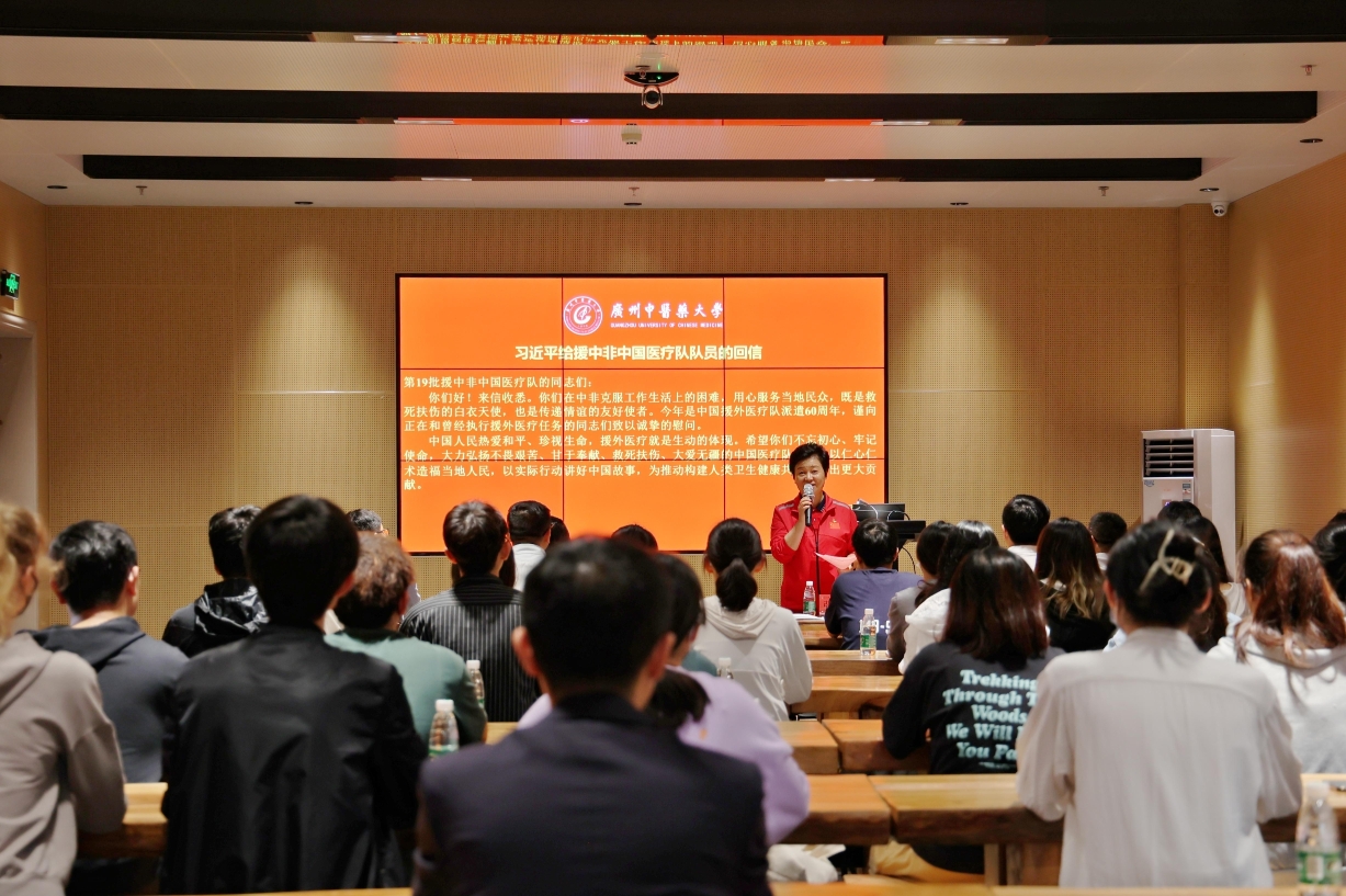 在广东中医药博物馆,张建华与同学们一同回顾学校青蒿素抗疟研究和援外抗疟的历史和成就,讲述援外医疗队员的救死扶伤的事迹和传递友谊的故事,勉励同学们从中医药发展史中,汲取智慧和力量,以更专业的知识服务“一带一路”,讲好中国故事,传播好中国声音,展示真实、立体、全面的中国。