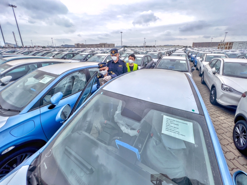 广州海关所属南沙海关关员对国产新能源汽车进行监管