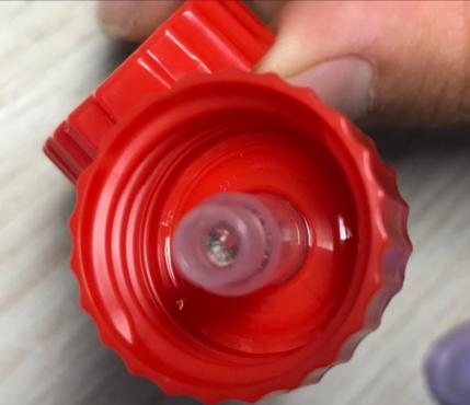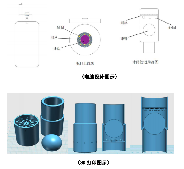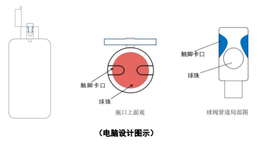 于是,詹承睿设计出了抗氧化保鲜物料瓶“球阀管道”装置的第一代产品——智能防回流导管。在他的设计中,挤压瓶身时,物料先经过“球阀管道”的小管道,再经过大管道,从球珠与触脚卡口之间的空隙顺利流出。