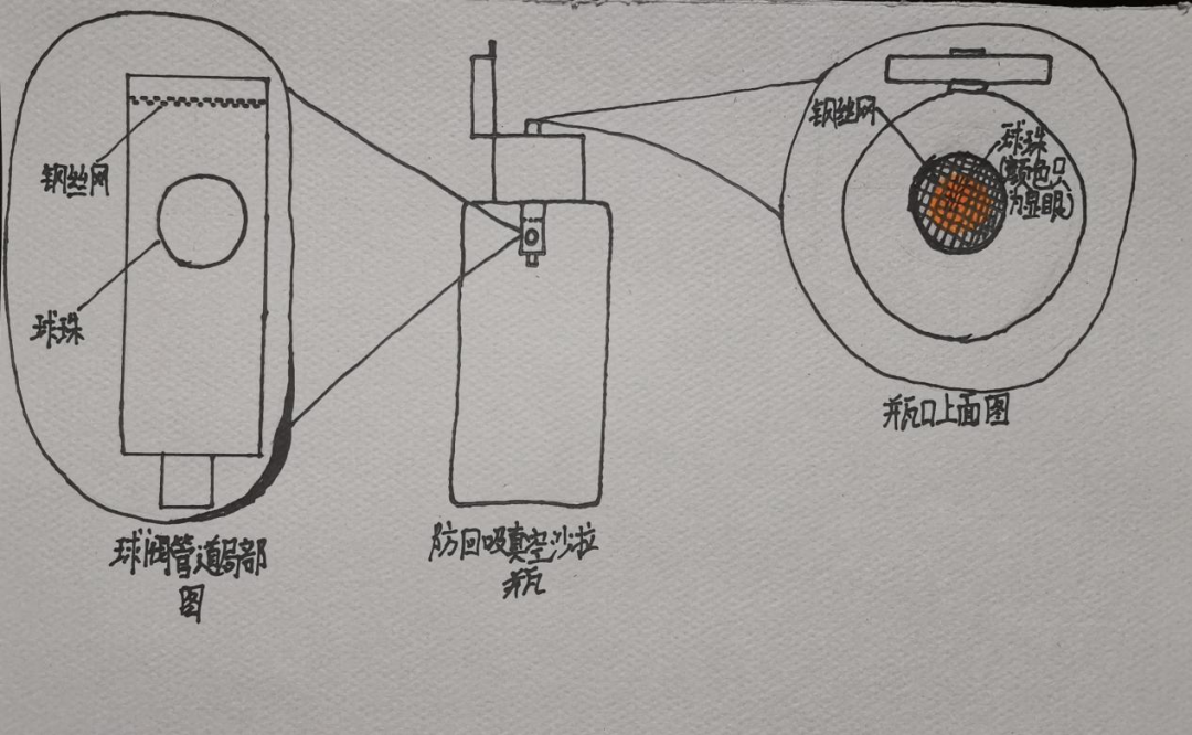 他从马桶水箱和钢笔笔芯中获得了灵感。其中,马桶水箱加水时有一个防回流装置,采用的是止回阀原理。而钢笔笔芯里有一个防墨水漏出的小球珠装置,可防止空气回吸。