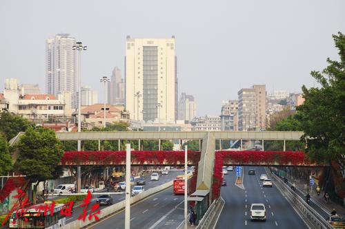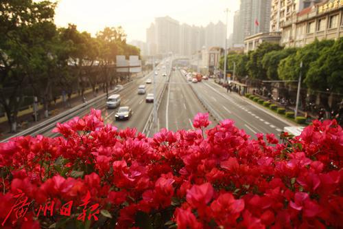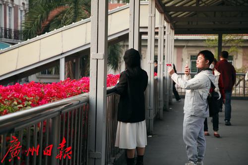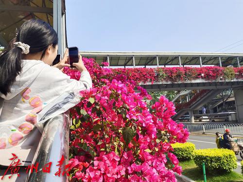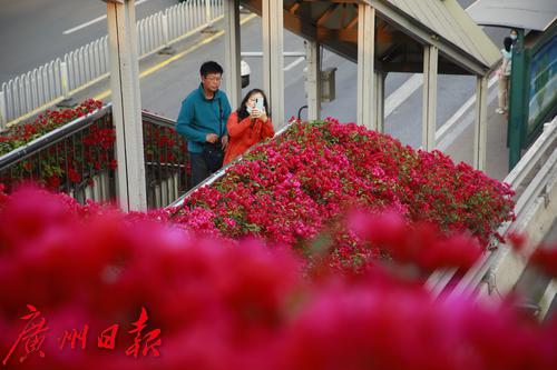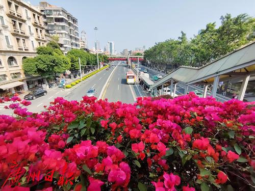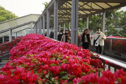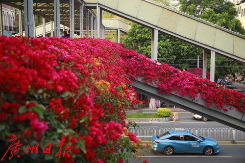 近日,在荔湾区六二三路,有两座人行天桥开满了红色的簕杜鹃,成为春日里一道亮丽的风景线。这两座天桥横跨于六二三路两侧,相隔不到百米,是很多游客去往沙面的捷径,也是到中间车道乘坐公交车的必经之路。盛开的簕杜鹃,彷佛把整座人行天桥上上下下都包裹了起来,非常壮观。