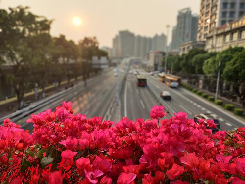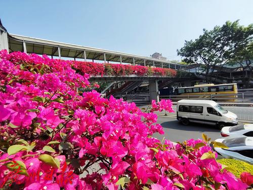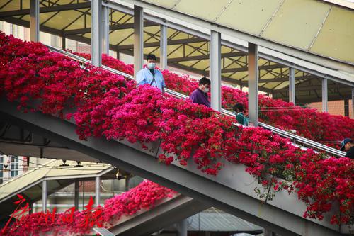 盛开的簕杜鹃把整座人行天桥上上下下都包裹了起来。