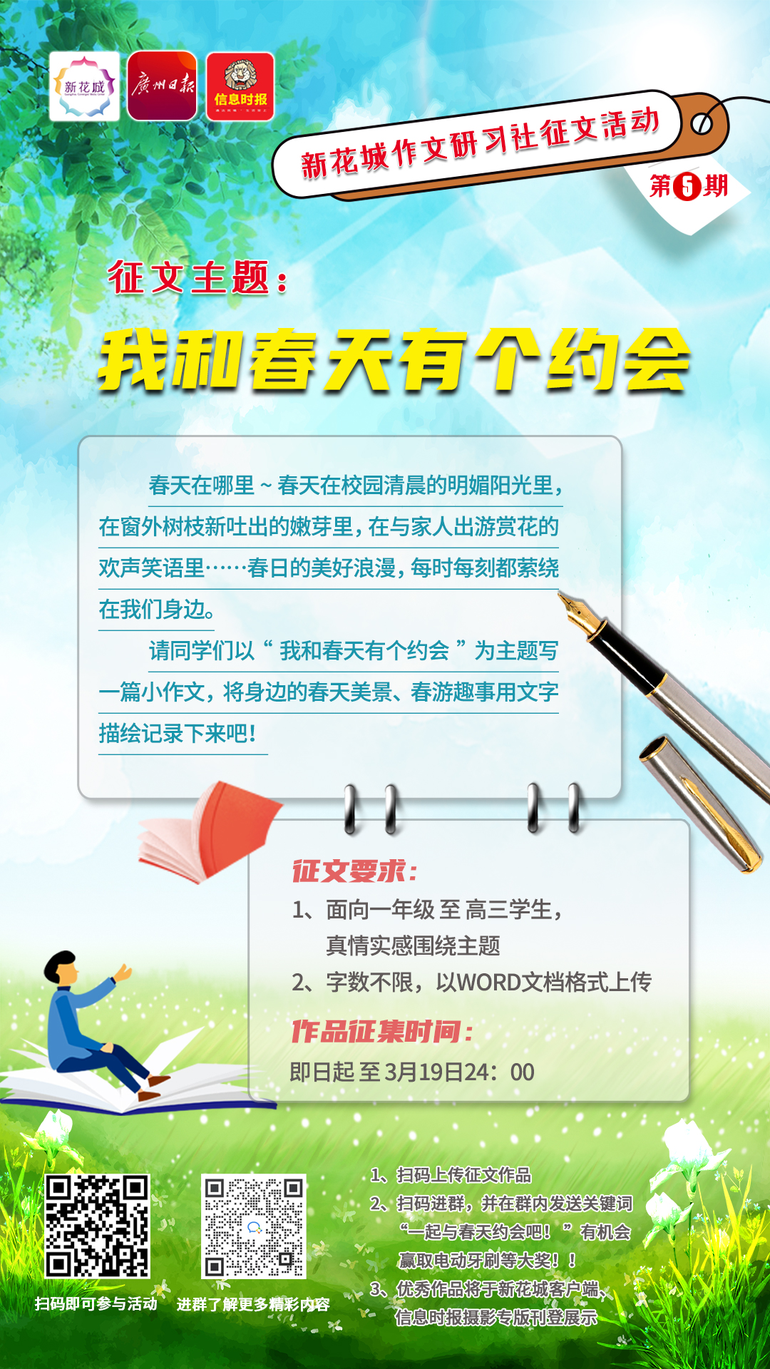 3月13日至3月20日,广州市区融媒云平台“新花城”联合信息时报《天天向上》专栏,发起了第5期以“我与春天有个约会”为主题的作文征集活动!